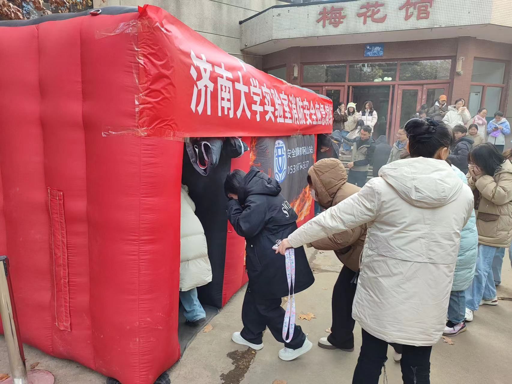 随后应急逃生演练在梅花馆门口展开。随着警报声响起参加演练的师生们迅速按照预定的逃生路线有序撤离大家用湿毛巾捂住口鼻弯腰低姿前行整个过程紧张有序真实模拟了火灾发生时的紧急逃生场景。