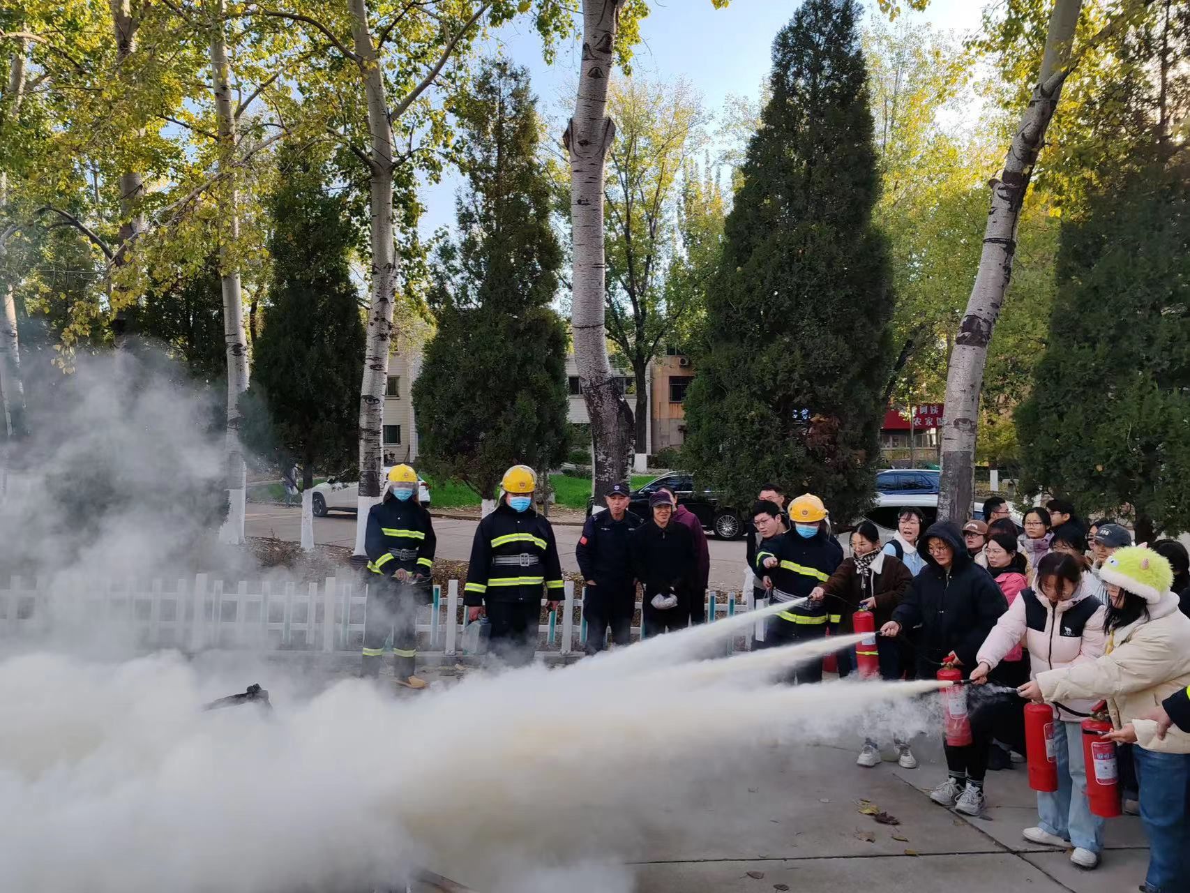 最后,灭火实战演练设置在绿泉广场南侧。在专业人员的指导下,师生们亲自上手操作灭火器,掌握了正确的灭火技巧,将理论知识与实际操作紧密结合。