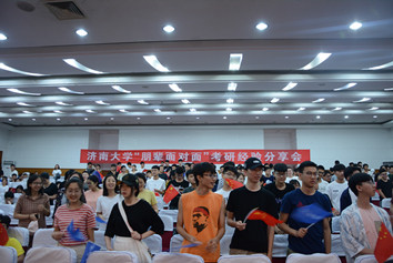 在随后的人物访谈环节,七位嘉宾与主持人和现场考研同学进行充分的交流。“只要坚持学渣也能逆袭为学霸”“通过夏令营了解别人在做什么”“找一个正能量研友相互扶持”以及考研全部录取的学霸宿舍是怎样炼成的,一系列小秘籍让同学们收获很多。此外,会场还展示学长学姐的寄语,把情真意切的考研感悟传递给大家。最后,在快闪《我相信》的激昂旋律中,学子们踏着催人奋进的节拍,挥动着手中的小旗,正式向着星辰大海进发。
