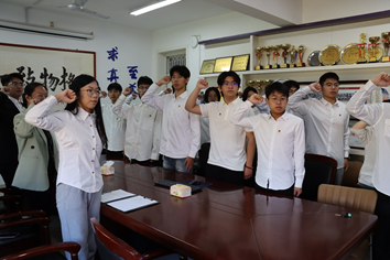 戴着团徽,新团员们举起右拳,庄严宣誓:“我志愿加入中国共产主义青年团……”一句句铿锵有力的誓言,是他们对团组织的忠诚承诺,是对理想信念的执着追求,也是对未来责任的勇敢担当。宣誓完毕后,老团员代表樊盛龙发言,他结合自身经历和身边优秀团员的事迹,讲述了自己对团员和共青团的认识。他提到“青春因磨砺而精彩,人生因奋斗而升华,”希望新团员们严格要求自己,不断成长进步。