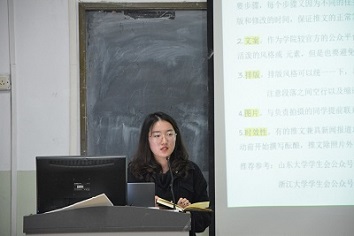 本期培训会主要分为写作、摄影、后期、推送四大方面,基本涵盖了新闻工作的各个环节,覆盖全面,有针对性。写作方面首先由青年通讯社采编部部长席晓婕同学为大家介绍了新闻稿件的投稿注意事项及基本写法,随后化学学院新闻网络中心的白杨同学以优秀稿件为案例,详尽细致地为大家介绍了不同类型写作的注意事项;摄影方面由新生辅导员伊梦寒老师为大家讲解了如何使用相机、画面的基本构图方式以及运用光与影的技巧去拍出精美照片的方法,同时幻坊动漫社的王嘉玮同学也从自身人像摄影的经验谈起,为到场同学讲述了不同场景下调节相机的方法;校学生会宣传部部长盆鑫雨同学从公众号建设经验谈起,详细的为大家讲述了一篇好推送的制作过程和注意事项,为大家讲解了PS的一些常用快捷键,并现场演示了利用PS对照片进行后期处理的方法。最后,新闻宣传中心指导教师弋媛老师对培训大会作出了总结,对受邀进行讲授的老师和同学们表达了感谢,同时她也寄语到场同学要始终坚守新闻人的初心,用爱和责任做好学院的新闻宣传工作。