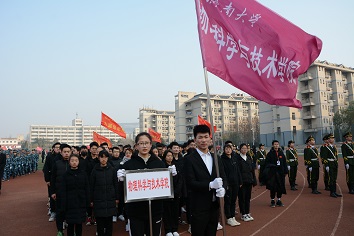 迎着冬日的暖阳,在随风飘扬的院旗下,物理学院学子高呼着“青春之我,初心不忘,物化冉冉,扬帆起航,知行合一,坚守信仰,悟理路上,青春飞扬”,个个神采奕奕、英姿飒爽,行进的队伍排成整齐的方队,展现出属于物院人的风采。他们尽情享受着阳光和运动的快感,全然忘记天气的寒冷,胸中唯有缅怀革命先辈、弘扬129爱国精神的一腔热血。