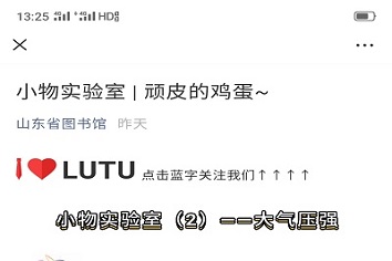 活动发起后,物院学子纷纷踊跃参与,希望为孩子们普及科学知识尽一份力。实验过程中用到了杯子、热水、鸡蛋等,瓶吞鸡蛋小实验是利用了压强这个知识点,由于热水使瓶内温度升高部分气体跑出瓶子,使得瓶内压强小于瓶外压强,所以瓶子把鸡蛋吞了进去。尽管部分同学在实验过程中出现了问题,但都在屡试屡验后成功完成了任务。志愿者们将提前录好的实验课堂的视频,实验课堂的文稿发送给山东省少儿图书馆的老师,小物实验课堂将在山东省少儿图书馆的微信公众号上推出,给孩子们普及物理小知识。这次线上实验活动增强了同学们的实践能力,更为索然无味的疫情生活增添了许多色彩。