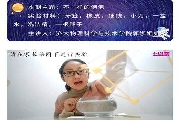 为了帮助小朋友们拓宽知识面、学习科学知识,济南大学物理学院的志愿者们利用自己的专业知识,在2020年6月14日举办了“不一样的泡泡”线上科普教学活动。