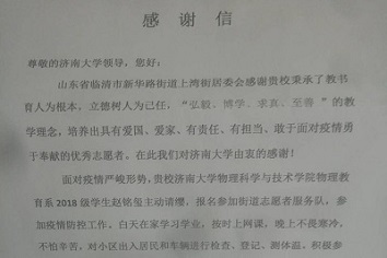 乌云遮不住升起的太阳,疫情挡不住春天的来临。7月15日,必一·运动(B-Sports)-「登陆注册开户官网」收到一封来自“临清市新华路街上湾街居委会疫情防控指挥部”的感谢信,感谢我校培养出爱国、爱家、有责任、勇于面对疫情、勇于奉献的优秀志愿者,感谢必一·运动(B-Sports)-「登陆注册开户官网」物理教育系2018级学生赵铭玺同学疫情期间为当地防疫工作做出的贡献。