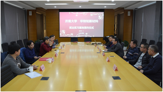 2019年1月23日下午,济南大学物理学院党委书记郑爱华、党委副书记王义、光电系夏伟教授、学办主任赵萍、团委书记朱思齐、辅导员张虎一行赴山东华特知新材料有限公司洽谈合作,签订就业实习基地合约。